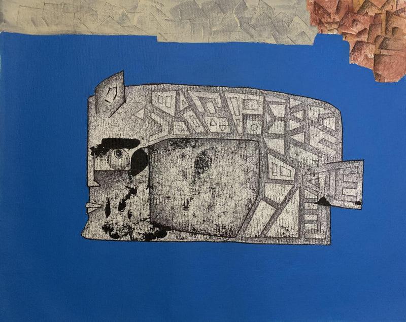This abstract artwork features a stylized fish composed of geometric shapes and patterns, set against a vibrant blue background. The artist uses a combination of line work and textured surfaces to create a visually engaging composition. The fish's form is simplified and abstracted, inviting viewers to interpret its symbolic meaning and connect with its expressive qualities.