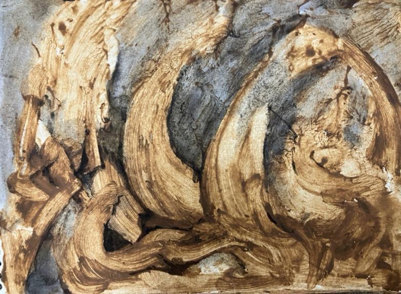 This abstract painting evokes a sense of cosmic energy and movement. The artist has skillfully used a palette of earthy tones and expressive brushstrokes to create a dynamic and textured composition. The swirling forms, reminiscent of celestial bodies or swirling vortices, suggest a sense of infinite energy and transformation. The surrounding lines and shapes add a sense of rhythm and flow to the artwork.