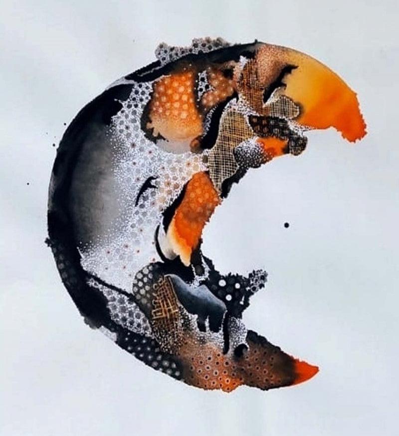 An abstract painting titled "Crescent of Intuition" by Huma Khan. The artwork features a crescent moon shape composed of intricate patterns and textures in shades of black, orange, and white. The piece evokes a sense of mystery and wonder, inviting viewers to contemplate the depths of their own intuition.