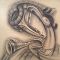 A monochromatic artwork featuring a stylized figure with a trumpet, rendered in intricate detail and subtle shading.