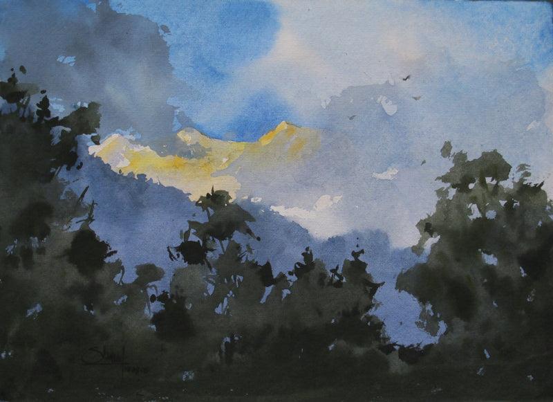 This captivating watercolor painting captures a serene mountain landscape shrouded in a soft, ethereal mist. The towering peaks, bathed in the warm glow of the rising sun, are partially obscured by the mist, creating a sense of mystery and wonder. The dark silhouette of the trees in the foreground adds depth and contrast to the scene. The artist's skillful use of color and light evokes a sense of tranquility and peace, inviting the viewer to immerse themselves in the beauty of the natural world.