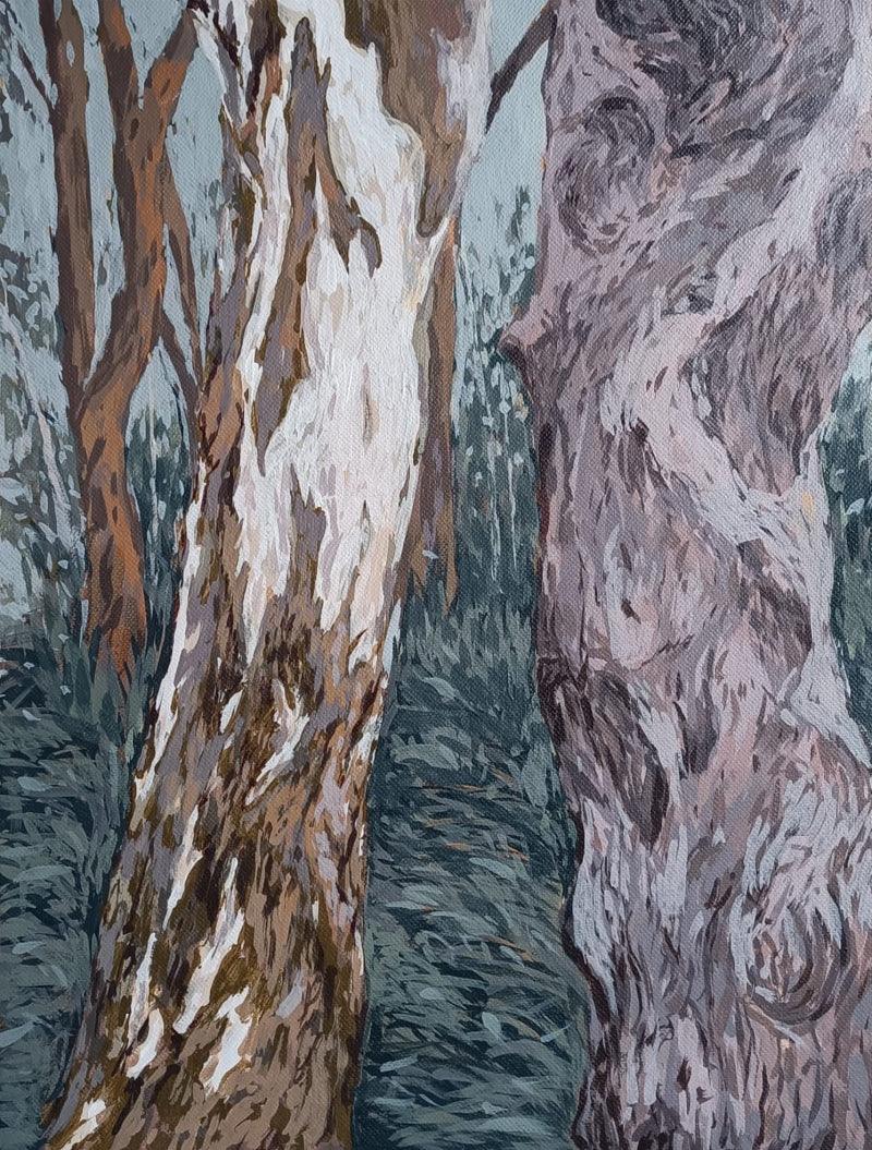 This captivating painting focuses on the intricate textures and forms of two tree trunks. The artist has skillfully captured the rough bark, the subtle variations in color, and the way the light plays on the surface. The muted palette and the emphasis on detail create a sense of intimacy and invite the viewer to appreciate the beauty of nature's intricate patterns.