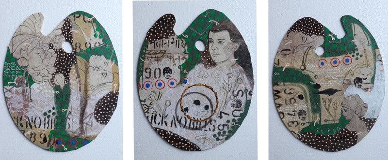 This triptych presents three mixed media collages, each utilizing an artist's palette as its canvas. The collages incorporate a variety of materials, including found imagery, text fragments, paint, and patterned paper. The palette shape provides a unique frame for exploring themes of art, creation, and identity. Each collage offers a distinct visual narrative, with recurring motifs of faces, objects, and abstract elements, inviting the viewer to interpret their individual and collective meanings.