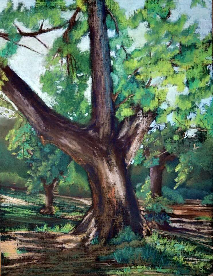 This pastel artwork by Niharika Garg showcases a majestic tree standing tall in a lush landscape. The artist's skillful use of pastels creates a sense of depth and texture, capturing the intricate details of the tree's bark, branches, and foliage. The vibrant colors and soft blending evoke a sense of tranquility and awe, inviting the viewer to appreciate the beauty and grandeur of the natural world.