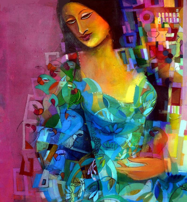 This painting depicts a woman surrounded by a vibrant flock of colorful parrots. The woman, with her serene expression and flowing hair, is holding a blossoming tree. The artist's use of bold colors and expressive brushstrokes creates a sense of energy and vitality. The juxtaposition of the woman's calm demeanor and the lively birds adds a sense of contrast and harmony to the composition.