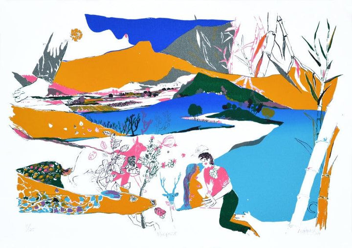 This vibrant print depicts a serene encounter between human figures and deer in a colorful landscape. The artist's expressive lines and bold use of color create a sense of harmony and tranquility, capturing the beauty of nature and the interconnectedness of all living things. A celebration of peaceful coexistence and the wonder of the natural world.