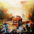 This vibrant oil painting captures the essence of a rainy day in Kolkata. A bright yellow taxi navigates through the wet streets, its reflection creating a captivating mirror image in the puddles. People with colorful umbrellas stroll through the scene, adding a touch of life and movement. The artist's use of bold colors and expressive brushstrokes creates a dynamic and energetic portrayal of the city.