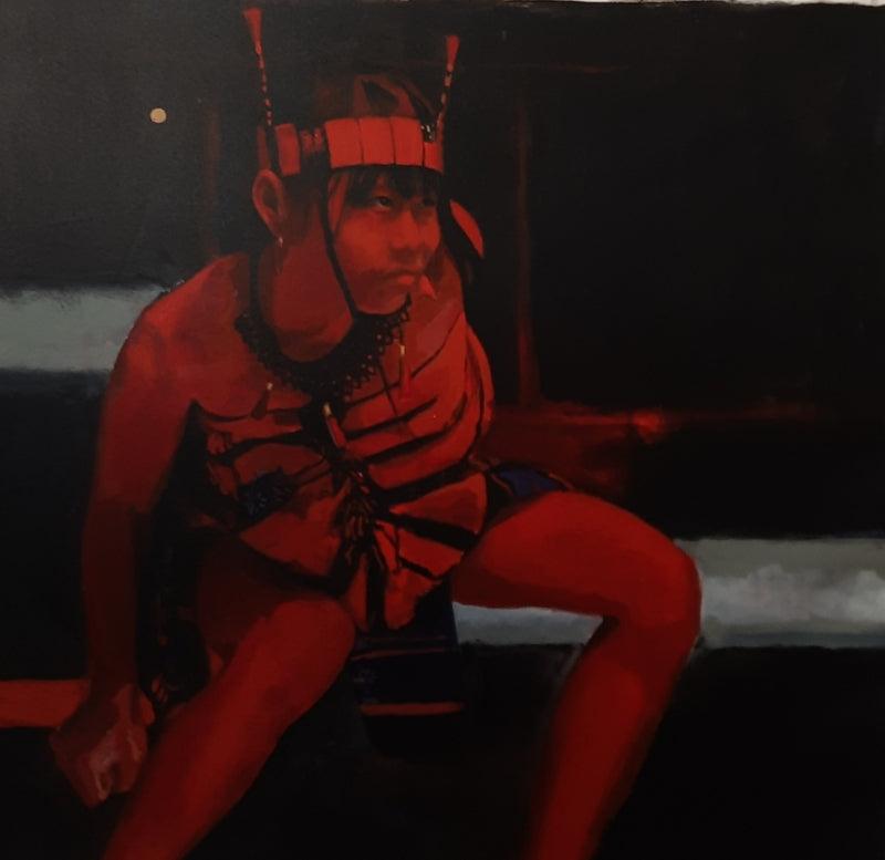 This captivating painting portrays a young girl adorned in a striking red costume, her gaze intense and focused. The rich, dark background and the vibrant red hue of the costume create a dramatic and mysterious atmosphere. The girl's intricate headpiece and the intricate details of her attire suggest a cultural or spiritual significance. This artwork invites the viewer to delve into the depths of her enigmatic expression, leaving room for interpretation and imagination.