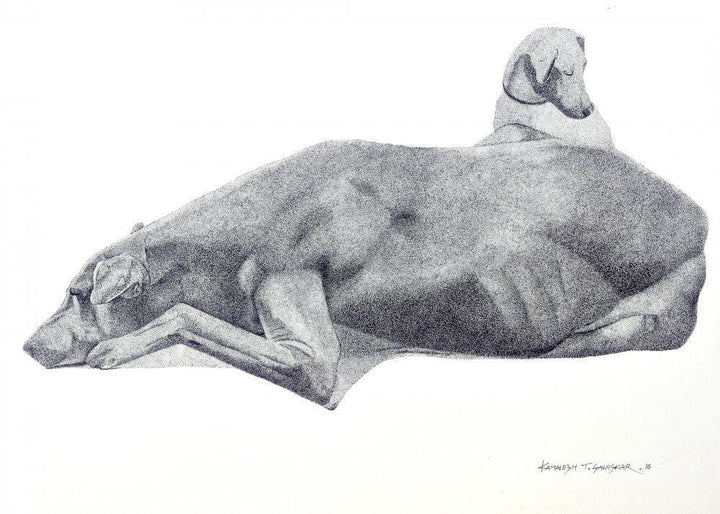 Hitesh Tiwari's "Resting Companions" is a masterful study in pen and ink. The artist meticulously captures the texture of the dogs' fur and the subtle interplay of light and shadow, creating a sense of depth and realism. The composition is balanced and serene, highlighting the peaceful bond between the two animals.