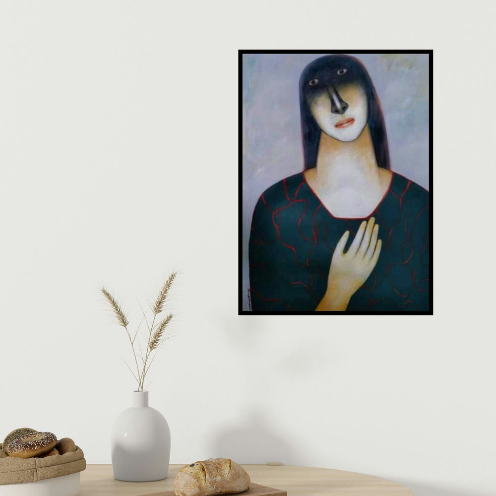 'She 1' painting by Mihir Kayal shown on a wall in a furnished room.