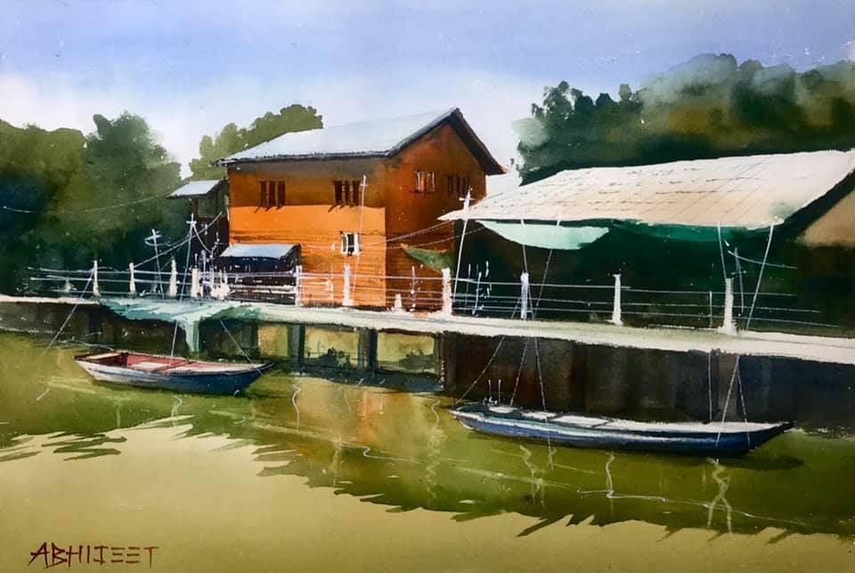 This captivating watercolor painting depicts a charming riverside scene. A vibrant orange house stands proudly on the bank, its reflection shimmering in the calm waters. The house is adorned with a thatched roof and a green canopy, adding to its rustic appeal. Small boats are gently moored along the riverbank, creating a picturesque atmosphere. Lush greenery frames the scene, adding depth and vibrancy to the composition. The overall impression is one of tranquility and natural beauty.