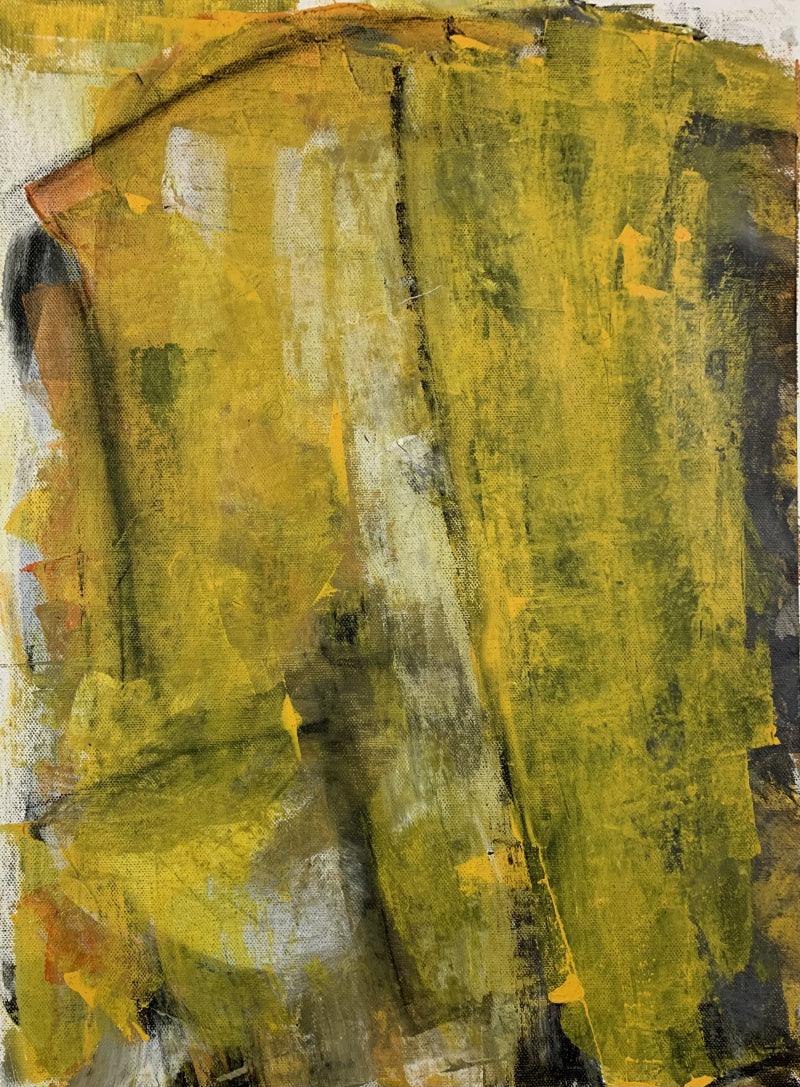 Abstract composition with geometric shapes and mixed media elements in yellow and green hues