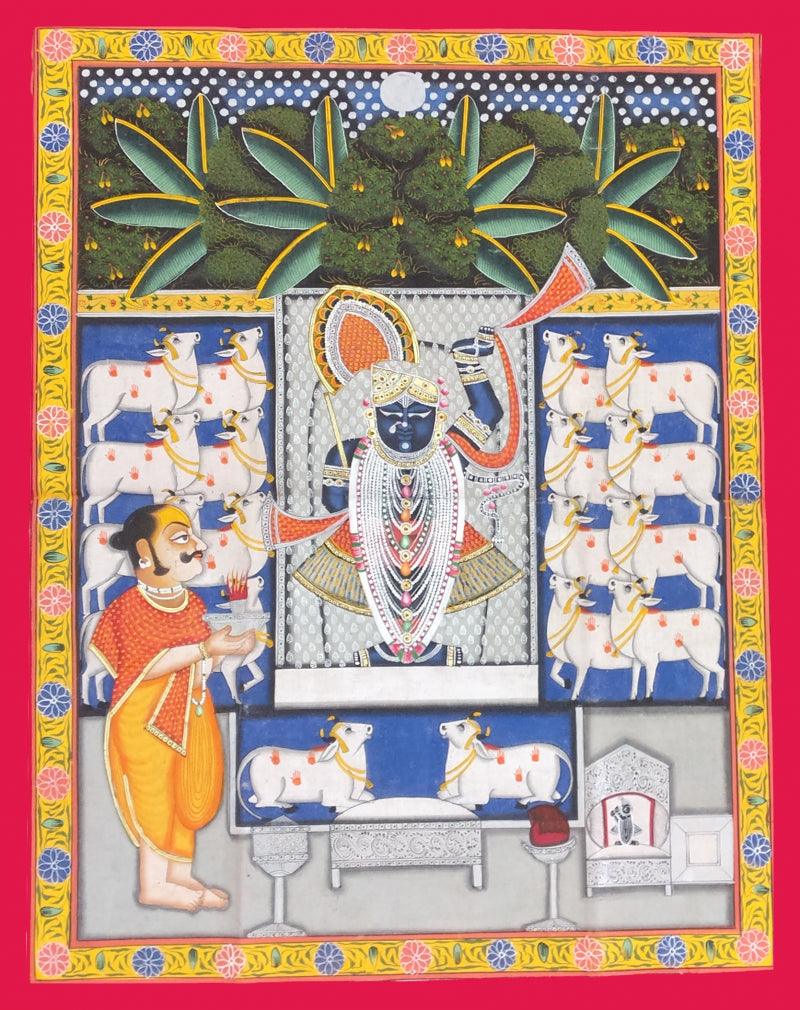 Shrinathji With Devotees And Kamdhenu Cloth Pichwai Traditional Art