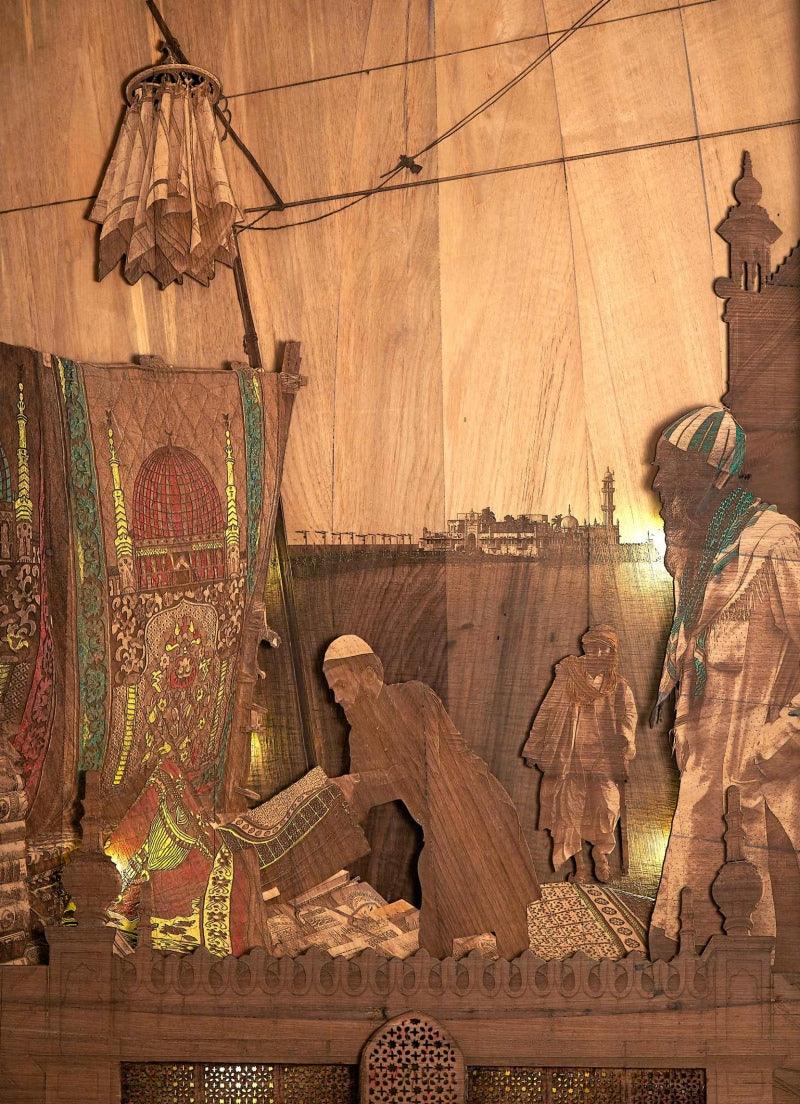 Silent Prayer (Mumbai Bazaar Scene) Teak Wood Cityscape Sculpture