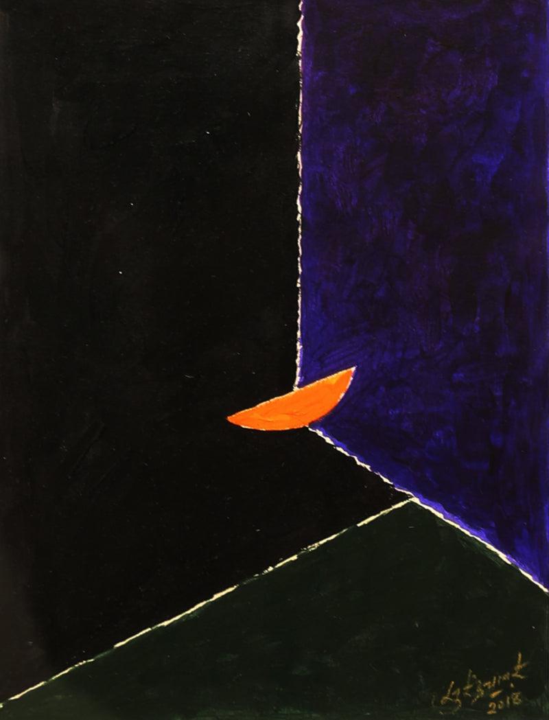 This captivating painting presents a minimalist and symbolic abstract composition, dominated by a dark, mysterious background. The artist's use of simple geometric shapes, such as a triangle and a crescent moon, creates a sense of balance and harmony. The vibrant orange hue of the crescent shape, representing the sun, contrasts dramatically with the dark background, suggesting a powerful and mysterious celestial event. The overall composition is both striking and thought-provoking, inviting the viewer to contemplate the cyclical nature of life and the ever-changing balance between light and darkness.