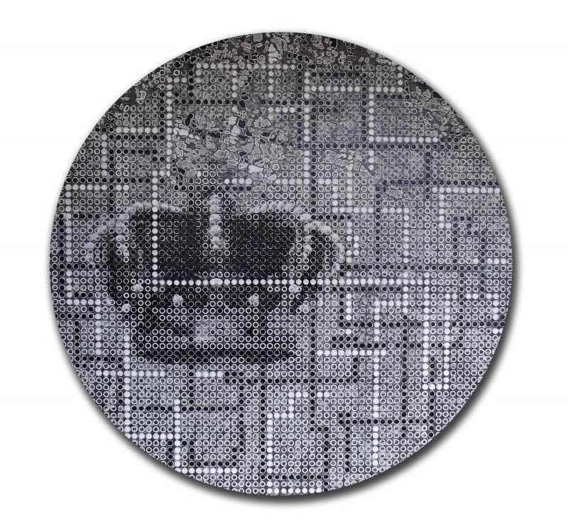 This mixed media artwork features a circular composition with a striking interplay of geometric patterns and textures. The artist employs a combination of printmaking, painting, and collage techniques to create a visually complex and layered image. The monochromatic color scheme and the intricate grid-like pattern evoke a sense of order and structure, while the subtle variations in texture and tone add depth and intrigue. The abstract nature of the work invites viewers to explore their own interpretations and engage with the visual language of form and pattern.