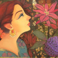This artwork by Renuka Fulsoundar is a depiction of a woman holding a lamp. Her expression is serene and contemplative, suggesting a sense of devotion or ritual. The warm colors and soft lighting create a peaceful and intimate atmosphere. The woman's attire and the surrounding foliage suggest a traditional Indian setting.