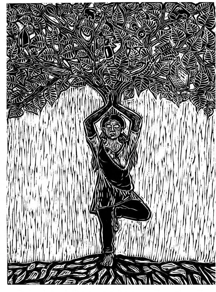 This artwork depicts a yogi practicing a standing yoga pose beneath a majestic tree. The tree is intricately detailed, with leaves and branches forming a canopy above the yogi. The figure's serene expression and grounded posture convey a sense of peace and harmony with nature. The artwork symbolizes the interconnectedness between humans and the natural world, and the practice of yoga as a way to cultivate inner peace and connect with the divine.