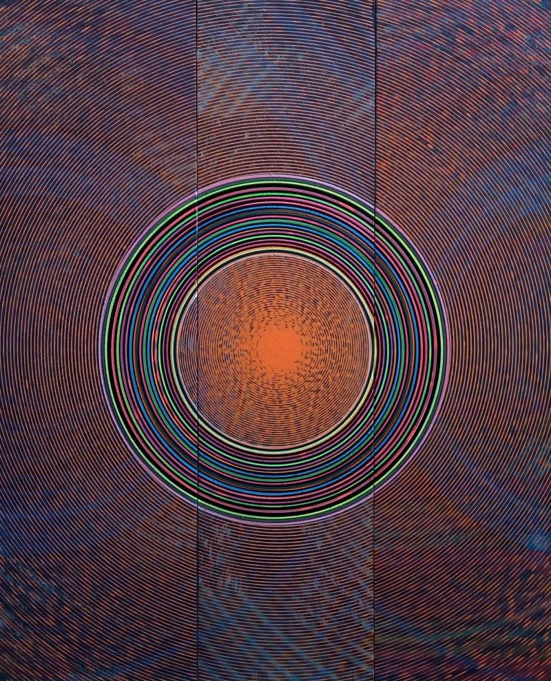 This triptych presents a mesmerizing pattern of concentric circles, radiating outward from a central point. The artist employs a limited color palette, with vibrant hues like orange and blue creating a sense of energy and dynamism. The intricate lines and subtle variations in color suggest a sense of movement and vibration, evoking a sense of cosmic energy.