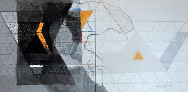 This abstract painting by Lalit Khanna explores the concept of convergence and the meeting point of opposing forces. The composition is divided into two distinct halves, one dominated by dark, angular shapes and the other by lighter, more delicate forms. A central point, marked by a vibrant yellow triangle, serves as the focal point where these contrasting elements intersect.