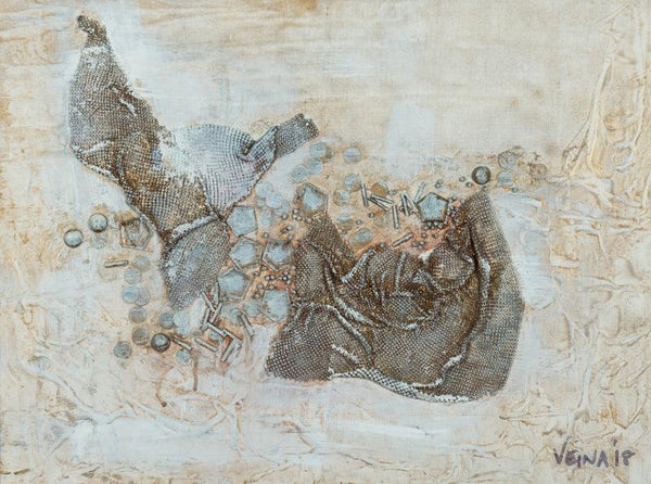 This mixed media artwork by Veina is a captivating study in texture and form. The artist utilizes a combination of materials, including paint, paper, and perhaps other elements, to create a layered and dynamic composition. The swirling patterns and organic shapes evoke a sense of movement and fluidity.