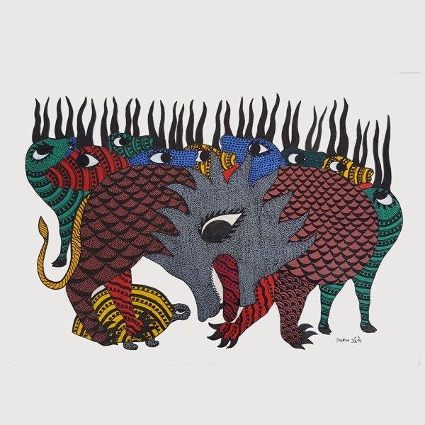 Tiger And Deers Gond Art Tribal Folk Art Painting