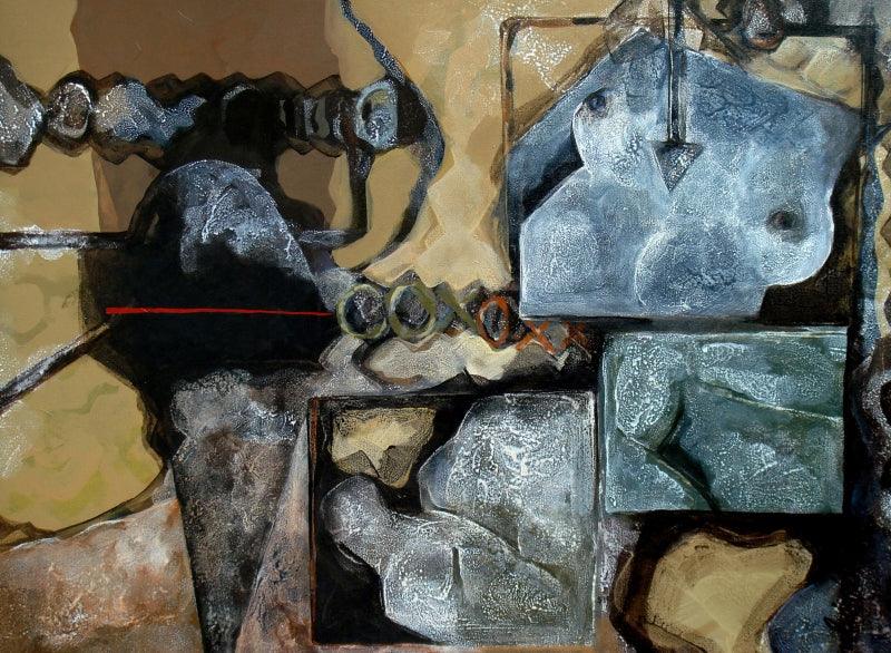 This abstract painting by Prabinkumar Nath evokes the energy and dynamism of an industrial landscape. The composition is characterized by a network of intersecting lines and shapes, suggesting the intricate machinery and infrastructure of a modern factory. The interplay of warm and cool colors creates a sense of depth and movement, inviting the viewer to explore the painting's complex layers and hidden spaces.