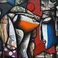 This abstract cubist painting depicts a trio of figures, their faces and bodies fragmented and reassembled in a dynamic and expressive manner. The artist has skillfully employed bold colors and geometric shapes to create a sense of depth and movement. The interplay of light and shadow further enhances the visual impact of the artwork. The painting invites viewers to contemplate the complex nature of human connection and the multifaceted nature of individual identity.
