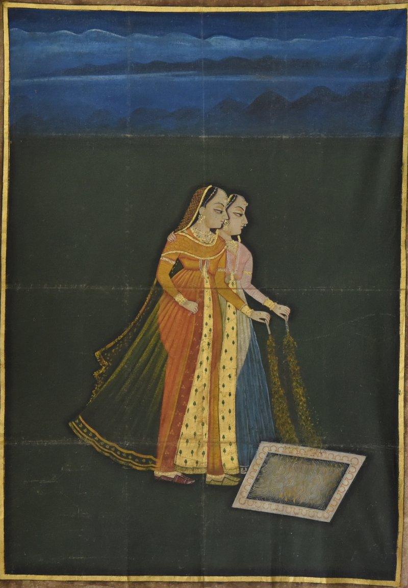 This miniature painting depicts two elegantly dressed ladies standing together in a serene landscape. The artist's use of delicate brushwork and vibrant colors creates a sense of elegance and refinement. The painting invites viewers to imagine the lives of these royal women, their conversations, and their place in the courtly world.