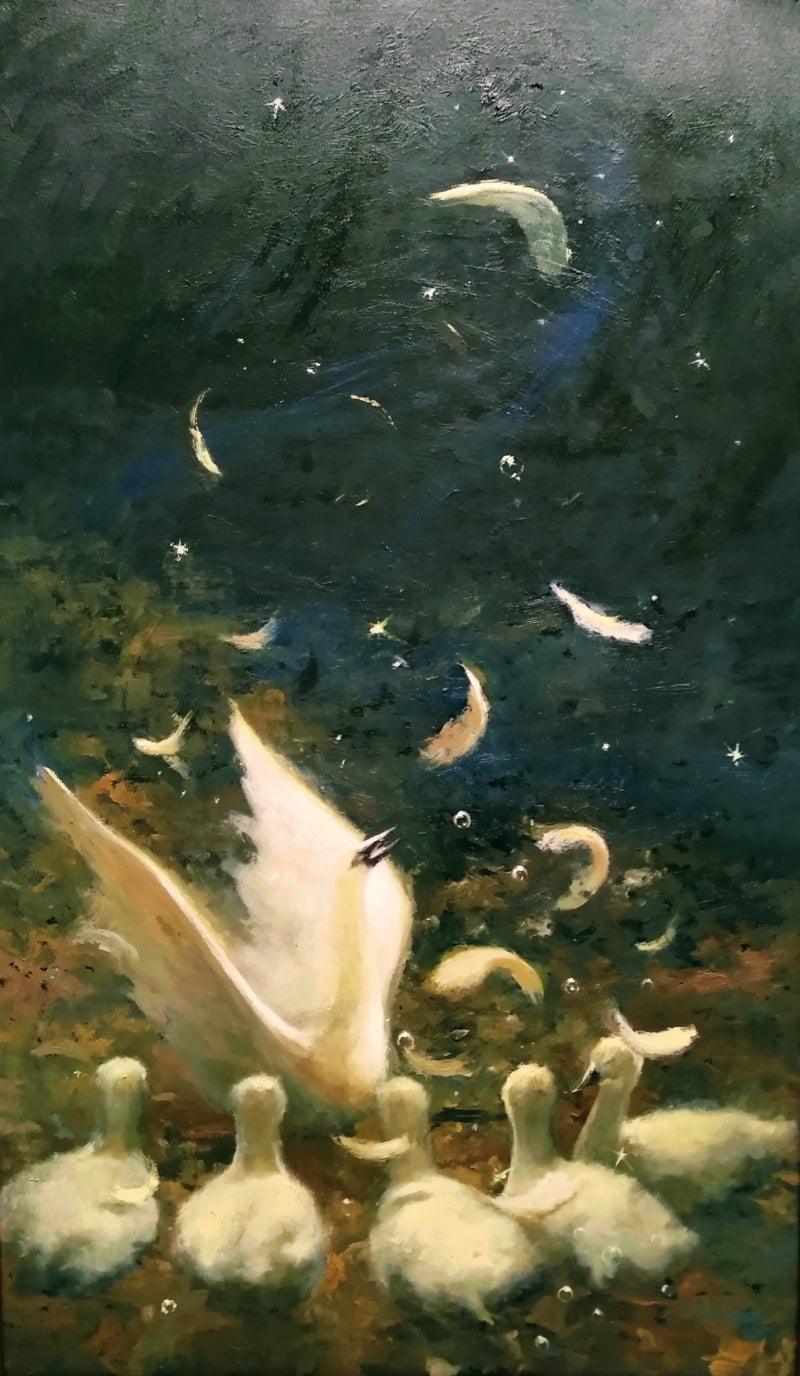 "Ud Jayega Hans Akela" by Abhishek Acharya captures a poignant moment of departure and solitude. The painting features a swan taking flight, leaving behind a group of smaller birds. The artist's use of soft, blended brushstrokes and a muted color palette creates a dreamlike atmosphere, emphasizing the themes of detachment and the individual journey. The composition, with the swan soaring upwards against a dark, textured background, evokes a sense of freedom and introspection. The title, which translates to "The Swan Will Fly Alone," adds a layer of meaning, highlighting the inevitable solitude of life's path.