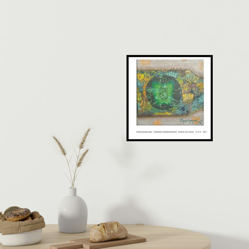 Acrylic on canvas, "Unspoken Understatement," by Pinaki Ranjan Bera, showcasing an abstract composition with a central circular form.
