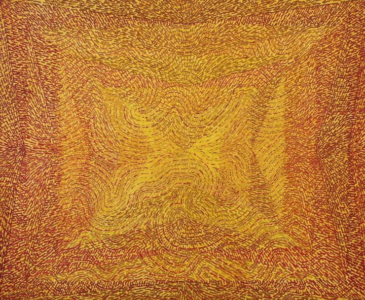 This abstract painting features a central area of bright, luminous yellow, surrounded by a textured border of deeper yellows and reds. The artist's skillful use of stippling and layering creates a sense of depth and dimension. The composition evokes a feeling of warmth and radiance, as if the canvas is emanating light.