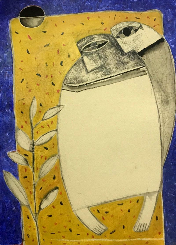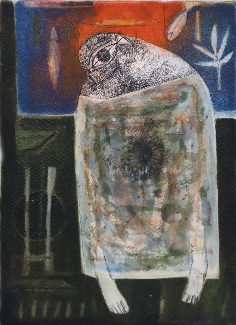 This mixed media painting presents an enigmatic figure with a single eye gazing introspectively. The figure is enveloped in a textured form, reminiscent of a shroud or blanket, which adds to the sense of mystery and contemplation. The artist uses a combination of drawing, painting, and collage techniques, layering colors and textures to create a rich and complex composition. The painting invites viewers to ponder themes of identity, introspection, and the human condition.