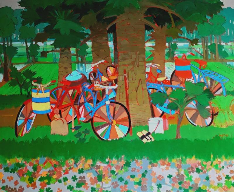 This vibrant painting depicts a peaceful scene of bicycles resting under the shade of trees in a rural landscape. The artist's use of bold colors and stylized forms creates a cheerful and idyllic atmosphere. The bicycles, each with its unique design and colorful wheels, suggest a pause in a journey, perhaps for a moment of rest or contemplation amidst the beauty of nature.