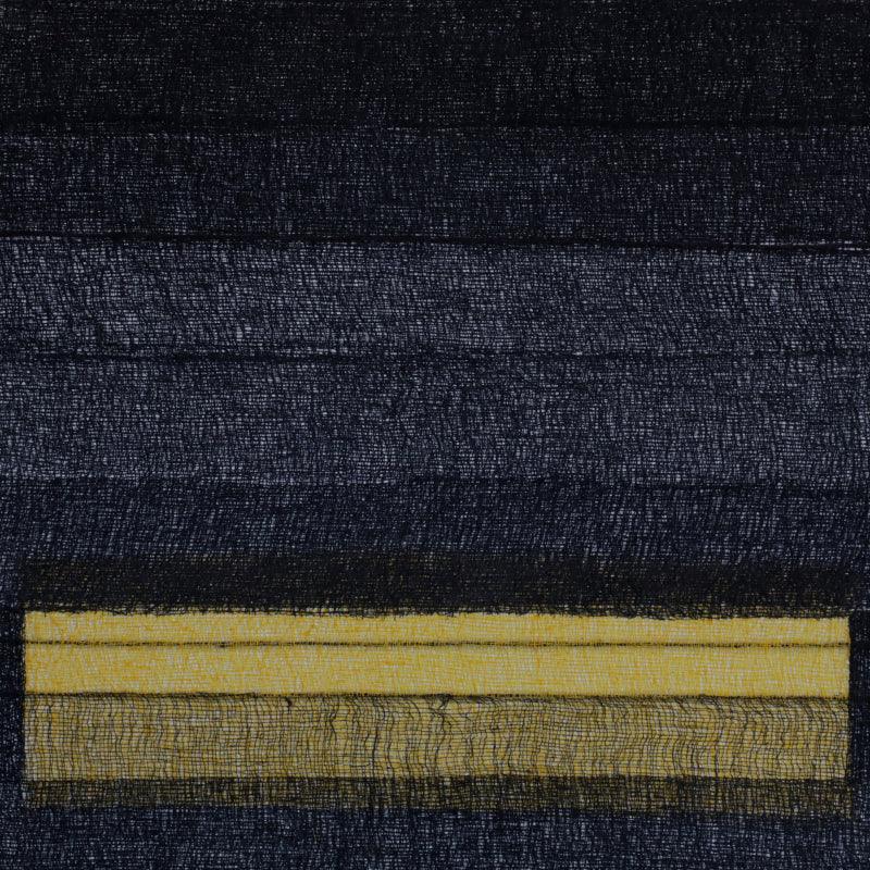 This abstract painting presents a mesmerizing interplay of textures and colors. The artist has skillfully employed a variety of techniques, including layering, stitching, and painting, to create a dynamic and tactile surface. The interplay of organic and geometric forms, combined with the vibrant hues of black, yellow, and gray, creates a visually stimulating composition. The overall effect is a captivating exploration of texture and color, inviting the viewer to delve into the depths of the artwork.