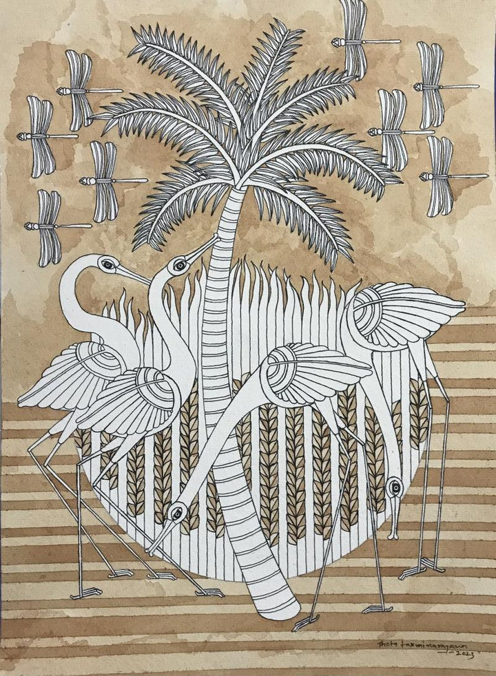 This painting showcases a serene landscape with a palm tree, three cranes, and a flock of dragonflies. The artist has used a minimalist style with simple lines and a limited color palette to create a sense of tranquility. The contrast between the white figures and the brown background adds depth and dimension to the artwork.