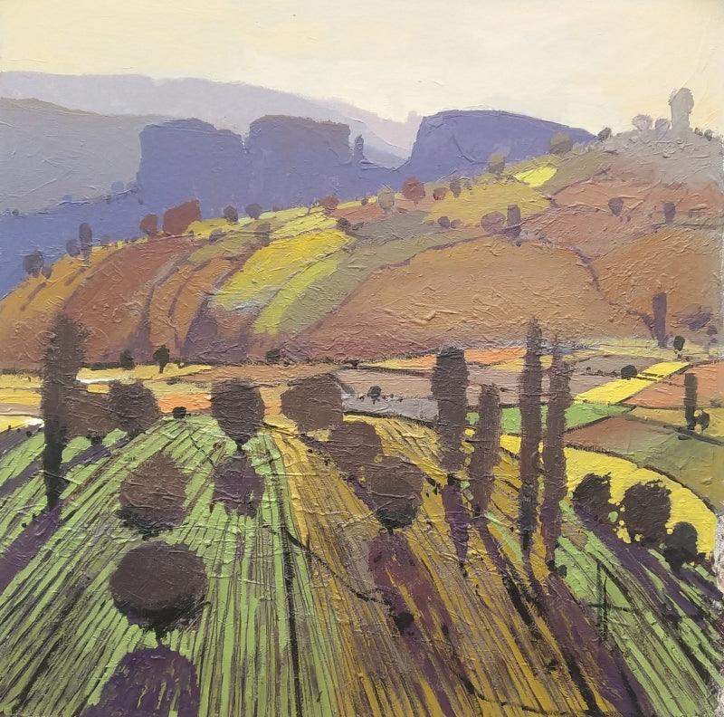 This painting captures the beauty of a rural landscape bathed in the warm light of autumn. Rolling hillsides are painted in a palette of vibrant yellows, oranges, and browns, while dark silhouettes of trees add depth and texture. The artwork evokes a sense of tranquility and the simple pleasures of rural life.