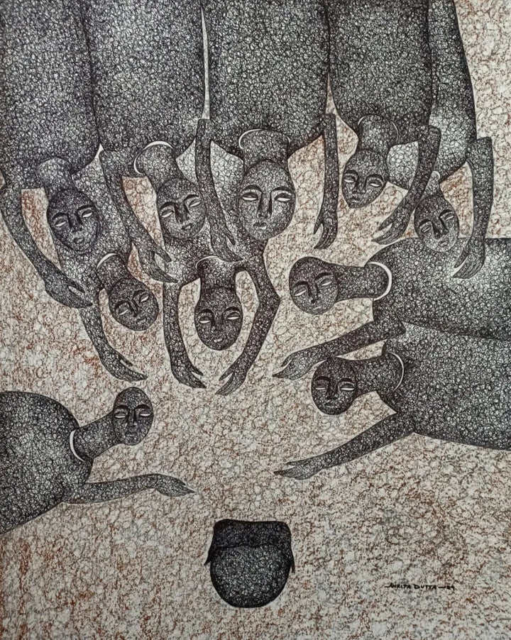 This captivating artwork depicts a group of figures, their heads tilted downwards, converging their gaze upon a single point. The artist's use of intricate line work and shading creates a sense of depth and texture, drawing the viewer's eye into the scene. The figures, with their simple yet expressive forms, seem to share a common purpose or fascination. The overall impression is one of unity and shared experience, inviting contemplation on the power of collective attention.