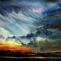The painting captures the dramatic beauty of a sunset sky, with swirling clouds in shades of blue, grey, and white dominating the upper portion of the image. The lower part of the painting features a fiery orange and red horizon, suggesting a landscape at dusk. The transition between the vibrant sunset colors and the stormy clouds creates a captivating contrast, evoking a sense of awe and wonder. The artist's expressive brushstrokes convey the dynamism of the sky, making it a truly mesmerizing piece.
