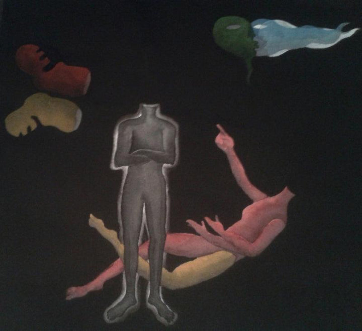 A surreal mixed media artwork depicting fragmented human figures and body parts floating against a dark background. The composition evokes a sense of disconnection, alienation, and the search for identity. The use of contrasting colors and textures adds to the dreamlike and unsettling atmosphere.