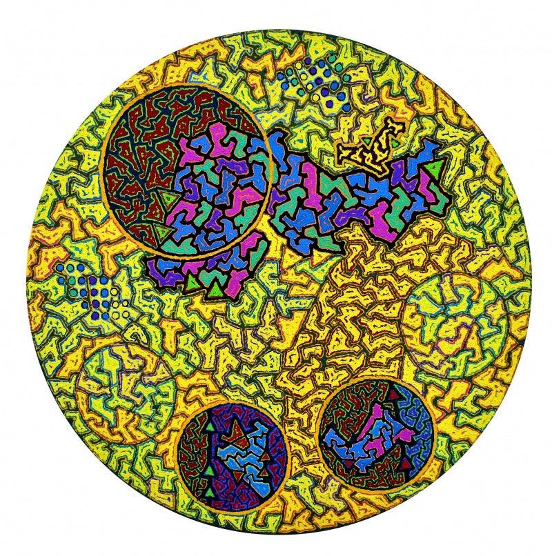 This vibrant painting presents a mesmerizing abstract composition. A swirling mass of colors and shapes fills the circular canvas, creating a sense of movement and dynamism. The intricate details and vibrant hues evoke a sense of cosmic energy and the vastness of the universe. The artwork invites viewers to get lost in its intricate patterns and explore the depths of their own imagination.