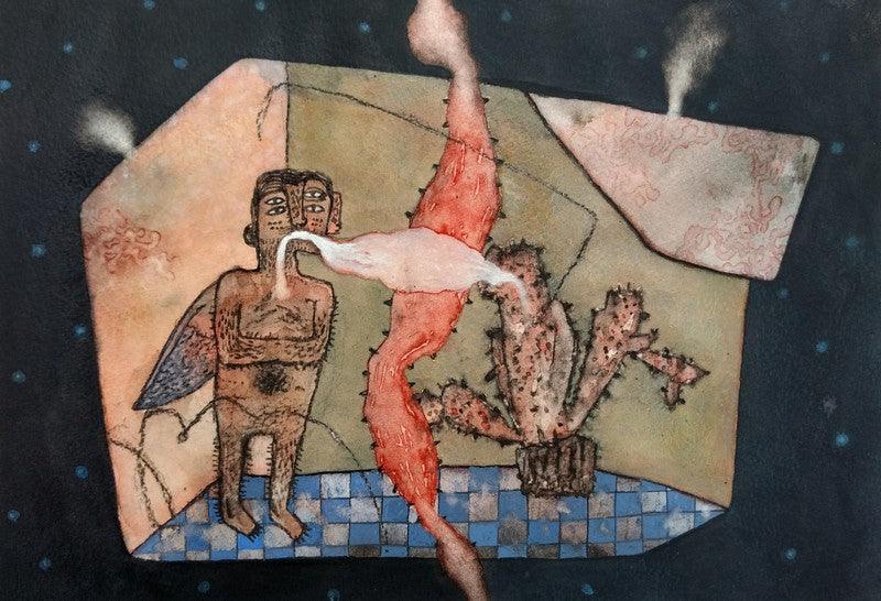 This intriguing artwork presents a winged figure and a cactus within a confined space, their forms connected by a vibrant red tendril that seems to emanate from the figure's mouth. The dreamlike atmosphere is enhanced by the starry background and the ethereal smoke rising from both the figure and the cactus. The artwork invites viewers to contemplate the relationship between the figure, the plant, and the connecting tendril, and to explore the symbolism and narrative within this enigmatic scene.