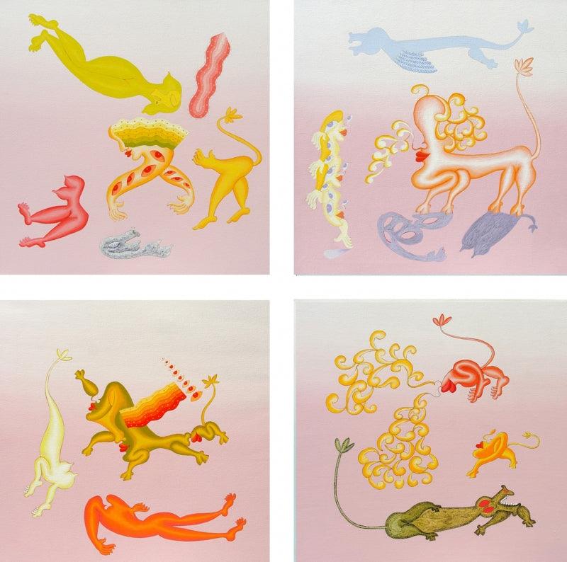 This artwork is a captivating quadriptych that explores the themes of transformation and metamorphosis. Each panel presents a unique and dreamlike scene featuring fantastical creatures and fragmented figures. The vibrant colors and fluid forms create a sense of wonder and intrigue, inviting the viewer to delve into the depths of their imagination.