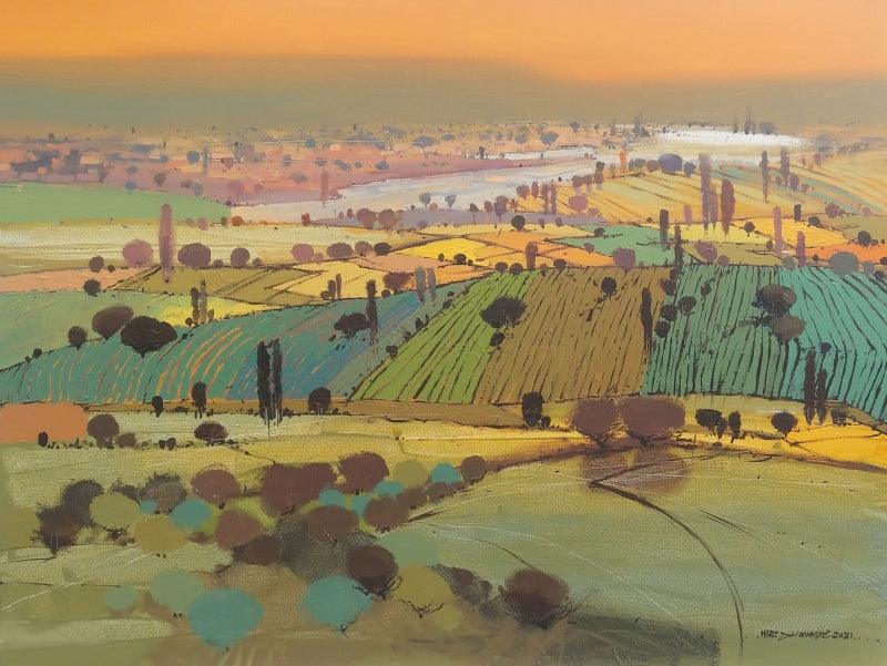 This painting captures the beauty of a Tuscan countryside bathed in the warm glow of the setting sun. Rolling hillsides, dotted with vineyards and olive groves, stretch towards the horizon. The artist uses a vibrant palette of yellows, oranges, and greens to convey the warmth and richness of the landscape.