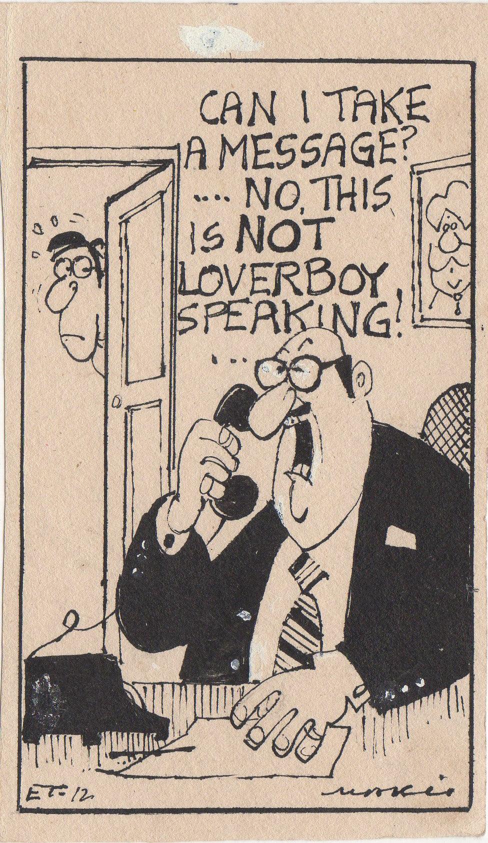 A cartoon illustration by Mario Miranda featuring a man at his desk, angrily speaking on the phone. Another man stands at the doorway, having offered to take a message. The man on the phone exclaims he is not "Loverboy," suggesting the caller might have the wrong number or is expecting someone more romantically inclined. The cartoon humorously captures the contrast between the caller's expectations and the receiver's gruff reality.