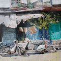 This captivating painting captures a serene moment in a quiet street. An old scooter, weathered by time, rests peacefully beside a rustic house with a worn-out tin roof. A colorful rug hangs from a window, adding a touch of warmth to the scene. The play of light and shadow creates a sense of depth and atmosphere, highlighting the intricate details of the architecture and the surrounding environment.