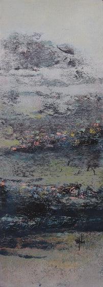 This artwork presents an abstract landscape rendered in soft, pastel tones. The composition evokes a dreamlike atmosphere, with wisps of color suggesting distant mountains and a hazy sky. Delicate brushstrokes create a sense of movement and fluidity, while subtle variations in color add depth and dimension. The overall effect is serene and contemplative, inviting the viewer to lose themselves in the dreamlike imagery.
