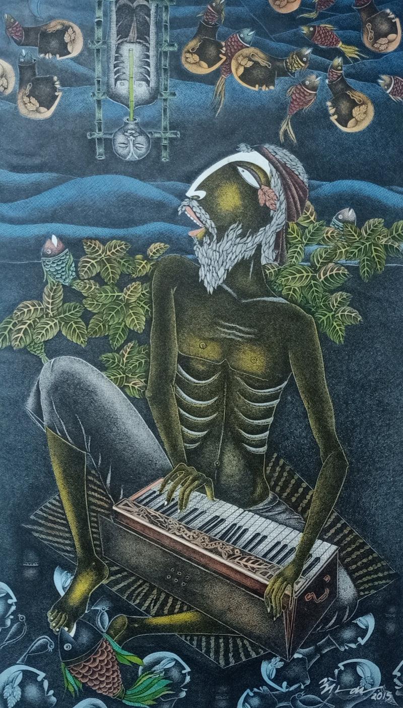 This captivating mixed media painting portrays a mystical figure engrossed in musical meditation. The artist has skillfully combined various techniques, including painting and drawing, to create a rich and textured composition. The figure, with its elongated limbs and serene expression, is surrounded by intricate patterns and symbols, suggesting a deep connection to the spiritual realm. The use of vibrant colors and bold lines adds a sense of energy and dynamism to the artwork.