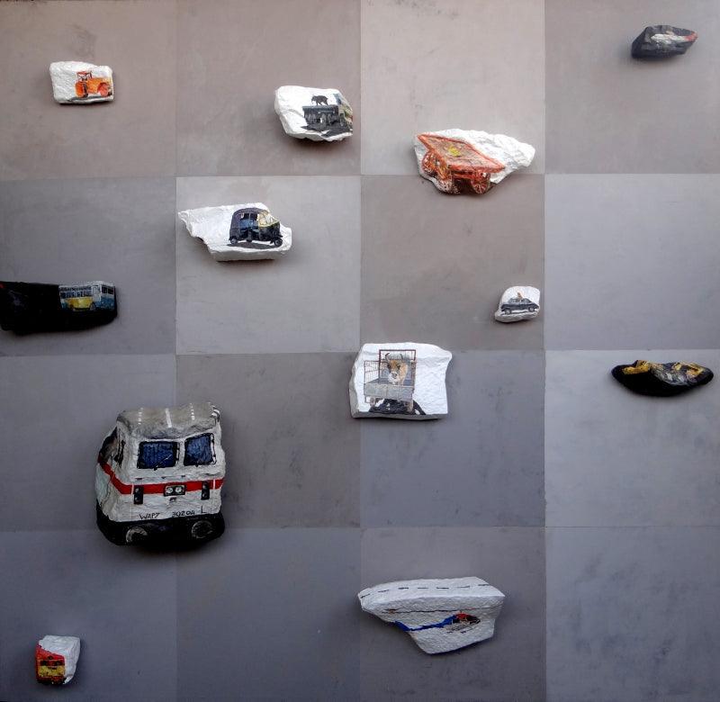 Mixed Media Wall Sculpture with Vehicles on Rocks