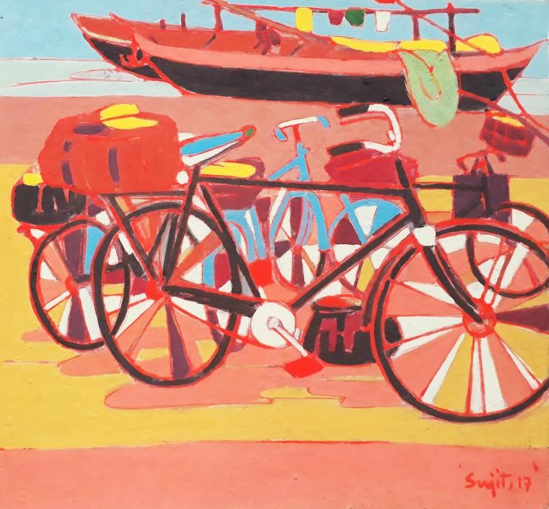 Untitled 30 (Wheels on the Sand) Tempera Cityscape Painting